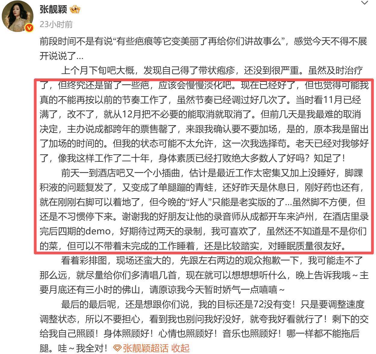 但就在昨天,张靓颖突然在社交平台发文透露自身的身体状况,称自己上个月确诊了带状疱疹,还没到很严重的程度。